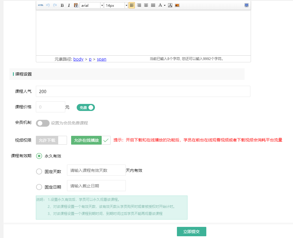 基本信息設置: 課程名稱、課程簡介、封面、課程價格、是否允許下載、是否允許在線觀看等。