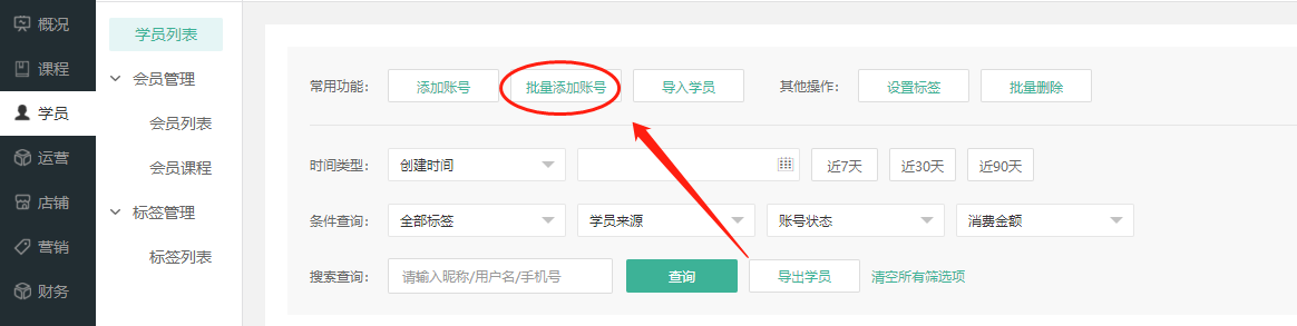 從【賬號管理】→【學員列表】,進入學員列表。點擊 【添加賬號】或【批量添加賬號】