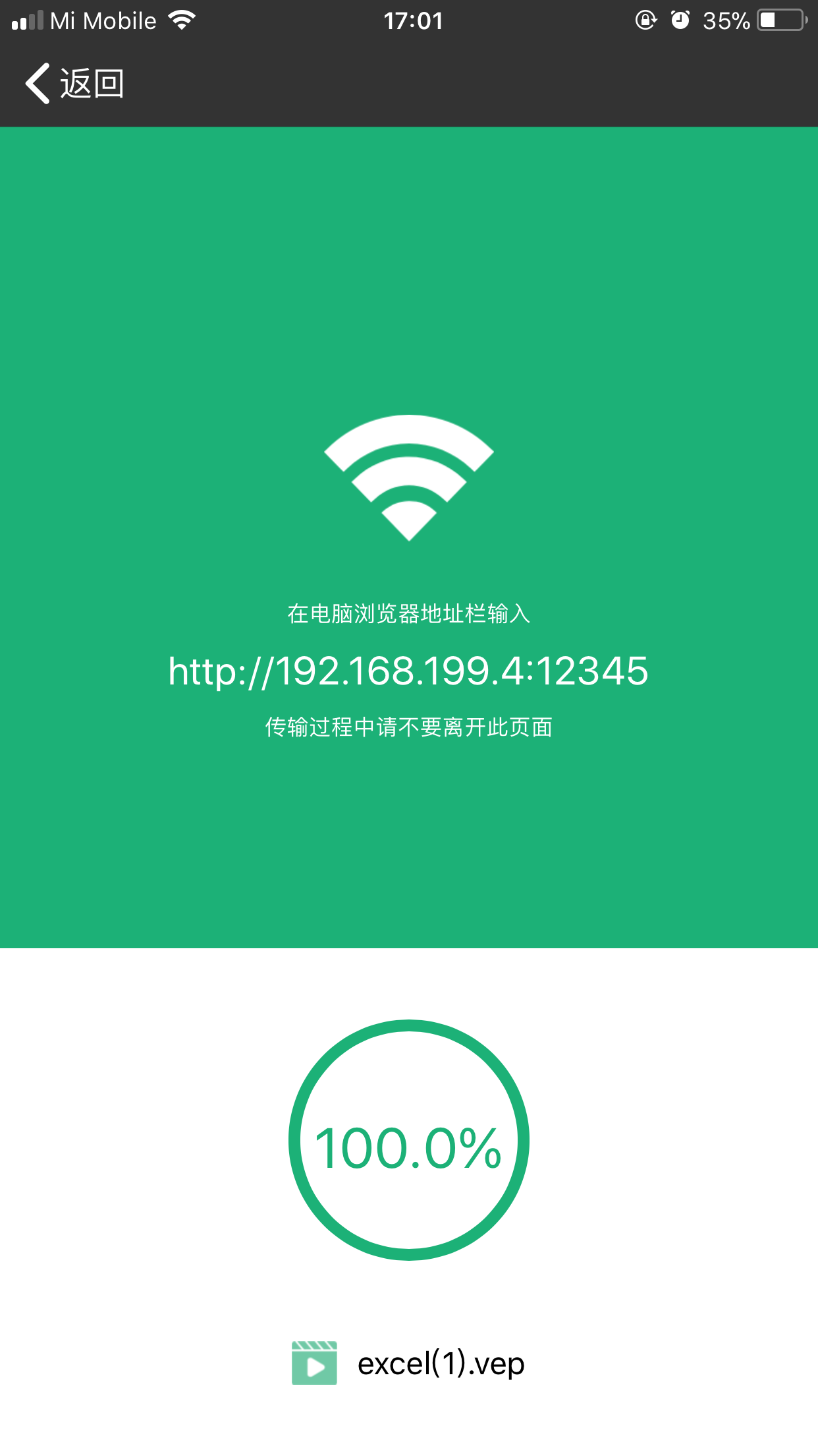 2、選擇WIFI傳輸之后會提示一個IP地址: