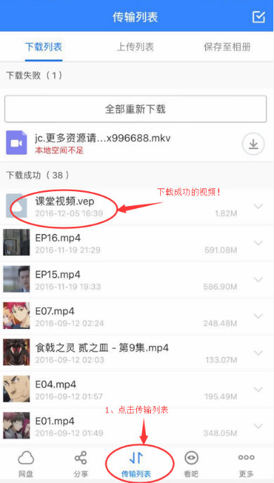 (3)、點擊“傳輸列表”,在下載列表中看到下載好的視頻: