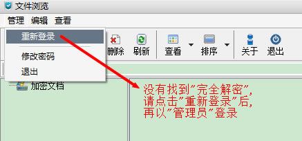如果在菜單上沒有找到?"完全解密"?這個選項, 請擊?"重新登錄", 然后再用"管理員"帳號登錄即可.