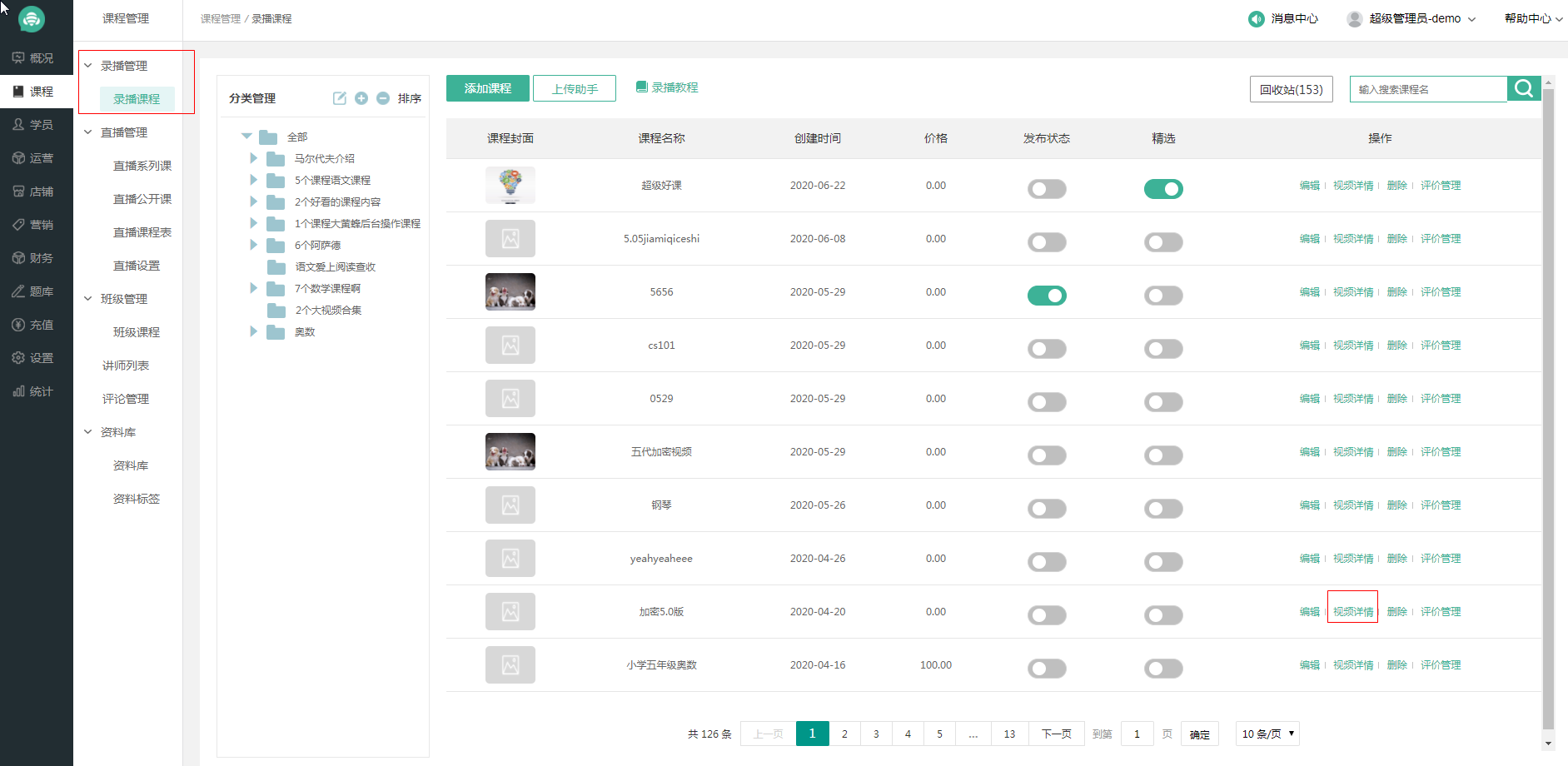 2、注冊并登錄網校管理后臺,在管理后臺課程“錄播管理”中,選擇已上傳的加密視頻課程,點擊“視頻詳情”。