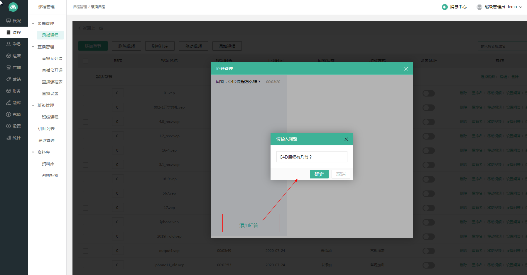 4、點擊“添加問答”,輸入防翻錄問答問題,如“C4D課程有幾節?”,點擊“確定”。