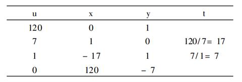 例1:找出x 和y, 使得7x+ 120y= 1。其運算過程見表1。