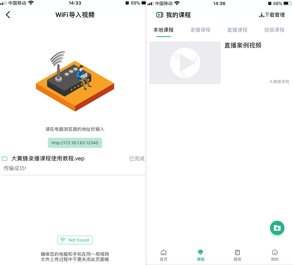 (1)WiFi導入視頻:需要先把加密視頻下載到電腦上;登錄APP,點擊【課程】-【本地視頻】- 導入視頻,選擇WiFi導入視頻;APP必須與電腦處于同一個WIFI下(即連接同一個路由),且傳輸過程中手機不能處于鎖屏狀態。