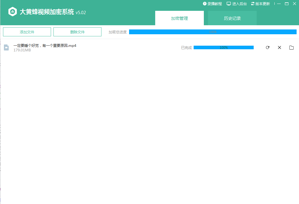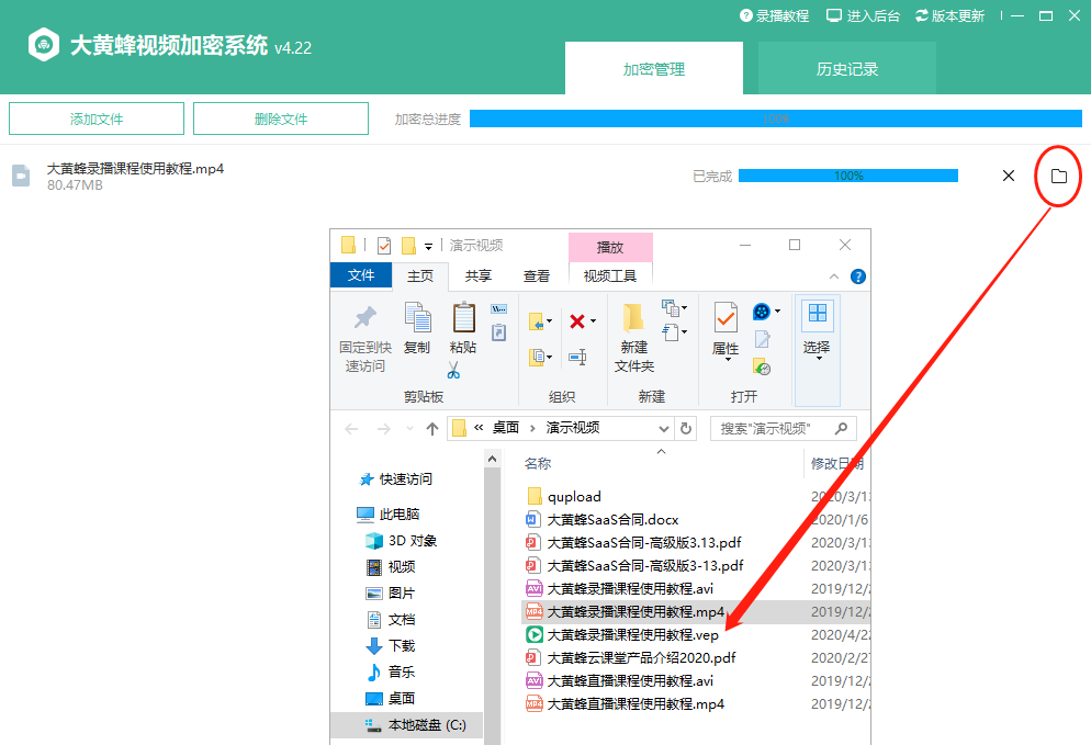 5、等待加密進(jìn)度條加載到100%后,提示加密完成,可查看加密好的手機(jī)視頻文件。