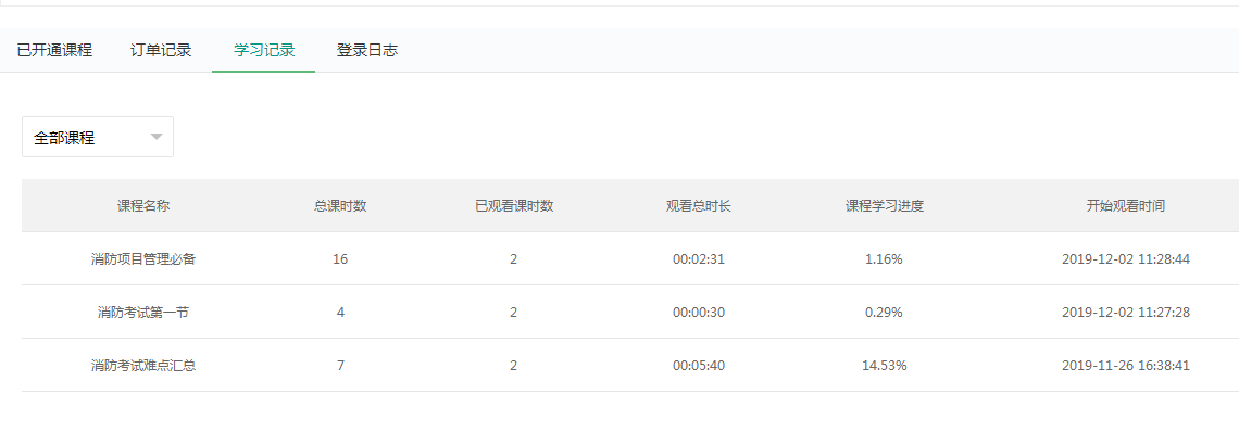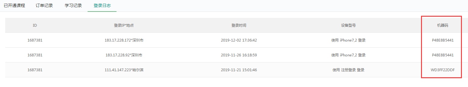 2、同時(shí)您可以進(jìn)一步結(jié)合學(xué)生的觀看記錄,登錄日志來判斷學(xué)生是否正在進(jìn)行可疑的翻錄,因?yàn)楸I錄者的一些習(xí)慣總會(huì)與正常學(xué)生不太一樣。同時(shí)我們可以根據(jù)登錄日志的機(jī)器碼,揪出一批有關(guān)聯(lián)的賬號(hào)。后臺(tái)—學(xué)員—學(xué)員列表—查看學(xué)員詳情學(xué)習(xí)記錄