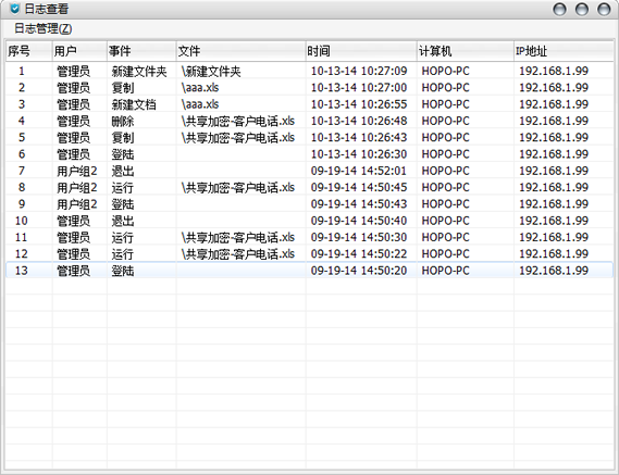 共享文件夾加密專家提供完備的日志管理,可記錄文件日志、管理日志、打印日志、授權日志等詳細日志,并提供日志查詢、導入、導出功能,確保文件操作的可追溯性。
