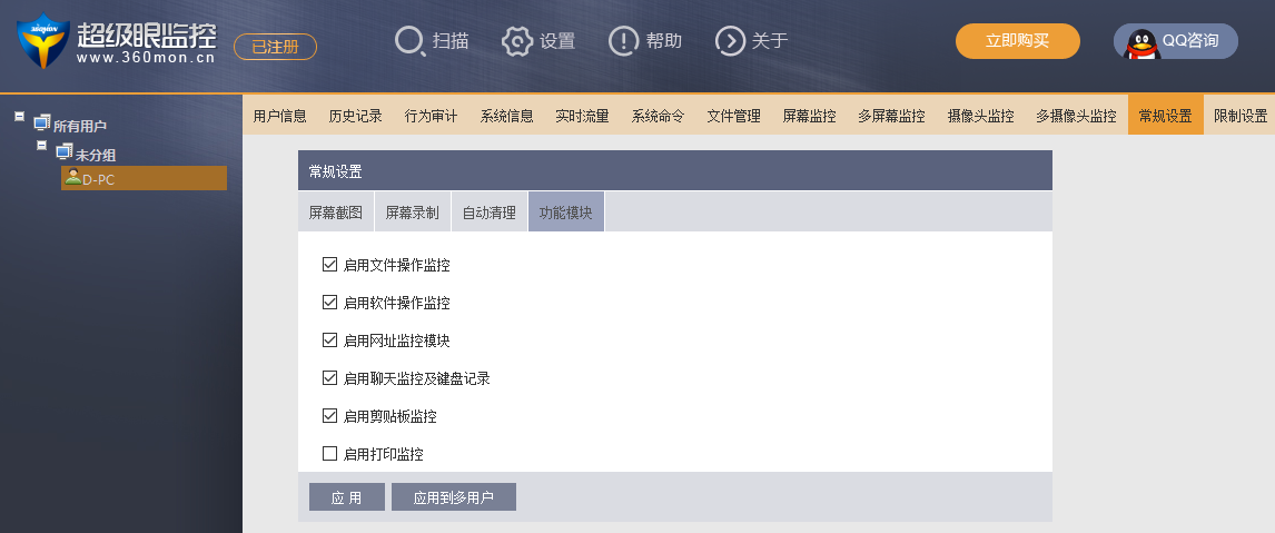 2、全面的歷史監(jiān)控功能:歷史管控屏幕截屏、歷史管控聊天管控日志、歷史管控網(wǎng)址日志、歷史管控郵件管控、歷史管控監(jiān)控統(tǒng)計(jì)、文件操作、郵件畫面、程序運(yùn)行、歷史管控運(yùn)行日志。
