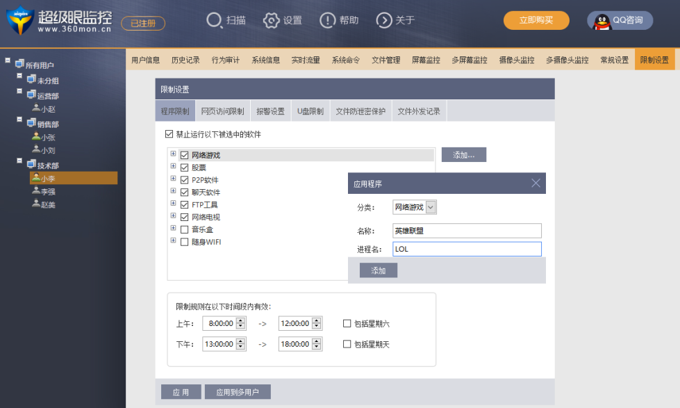 上網(wǎng)行為監(jiān)控軟件可以很容易地指定員工不能安裝和使用的程序,如迅雷、風行、股票交易軟件等,防止員工下載大量下載以降低公司網(wǎng)速,防止員工將大量工作時間花在與工作無關的事情上。該軟件自帶的數(shù)據(jù)庫可以禁止和屏蔽最常用的與工作無關的軟件,還可以添加需要禁止的程序進程。