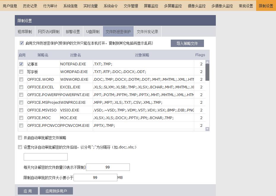 超級眼企業(yè)網(wǎng)絡監(jiān)控軟件集成有大量經(jīng)過分類的常用軟件,并可自主添加需要管理的程序,建立起龐大的軟件庫。超級眼內(nèi)網(wǎng)詳細分析了各種應用程序的名稱、大小、窗口標題等使用信息,采取了多種方式信息匹配,可以完全做到不被客戶端隱瞞欺騙過去。