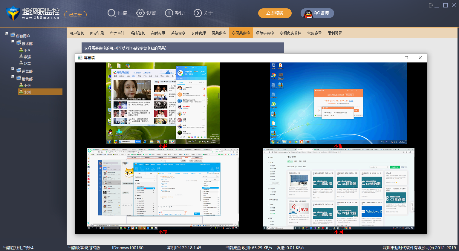 遠程電腦屏幕查看使用超級眼網管軟件不僅方便簡單,而且功能完善,可以實現遠程屏幕實時查看,可以批量一對多或是多對多的屏幕監控,限定每個管理員的權限,及允許控制的電腦,多個管理員可以在不同地點同時登錄軟件,方便企業管理人員間的協同作業。除了實時遠程電腦屏幕查還可以進行遠程桌面的操作,上傳下載文件,文字聊天;打開多臺電腦的攝像頭,并同時觀看攝像頭視頻,可用于周圍環境的安全監控。在批量操作中可以同時關閉、重啟或注銷多臺電腦,方便公司電腦的統一管理。