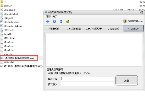 插上U盤, 運行U盤防拷貝系統軟件進行加密,加密成功后, U盤的序列號會自動被提交到服務器上作記錄。