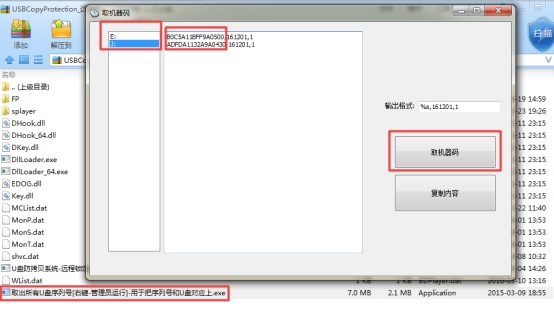 加密成功后, 運行"取出所有U盤序列號(右鍵-管理員運行)"這個軟件,點擊"取機器碼",就可以把盤符和相對應的U盤序列號取出來。